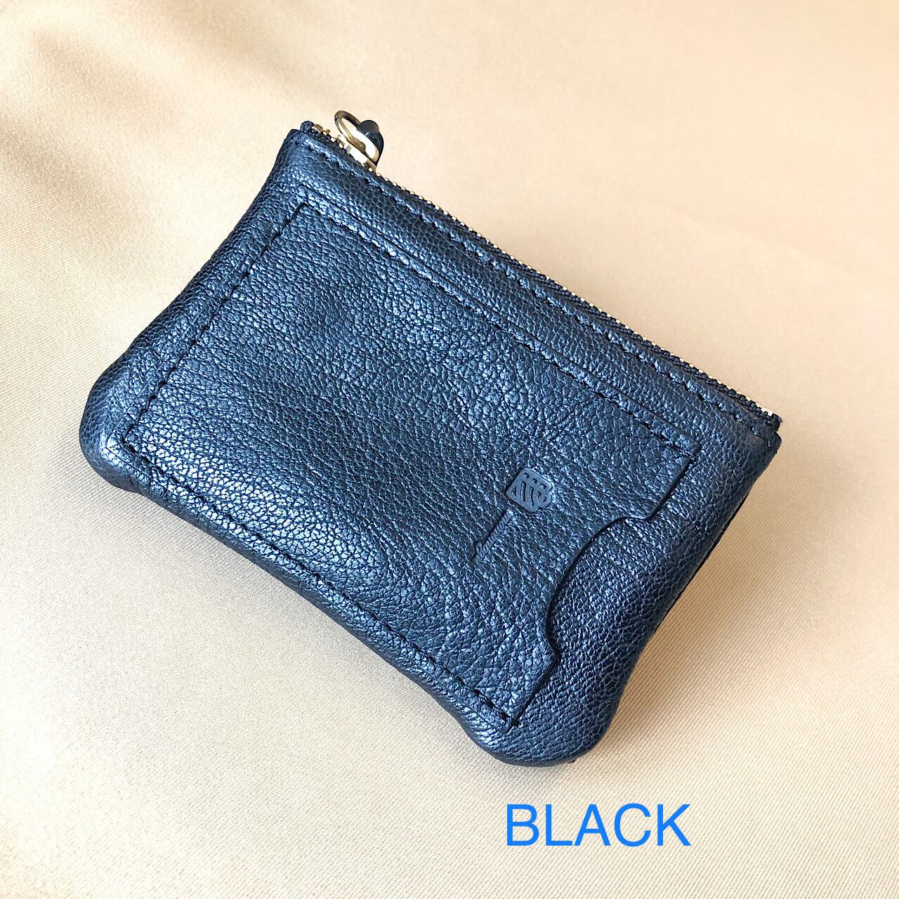 やぎ革を使ったスナップボタンキーケースです。スナップボタンを開けると4連のキーホルダー、ジップを開けるとキーリングが付いています。
